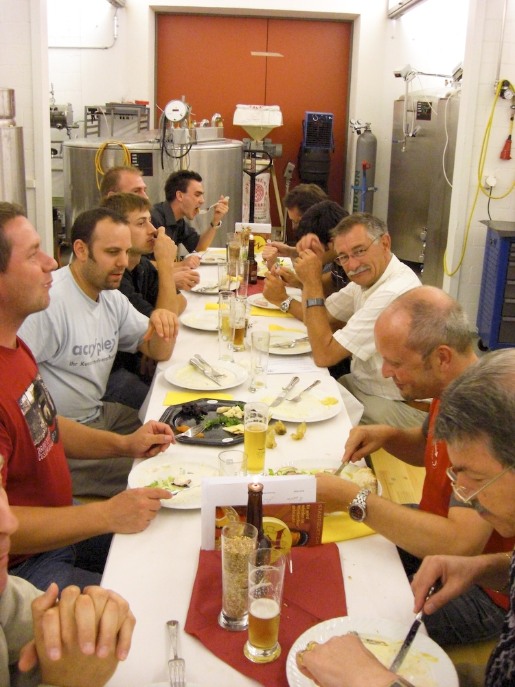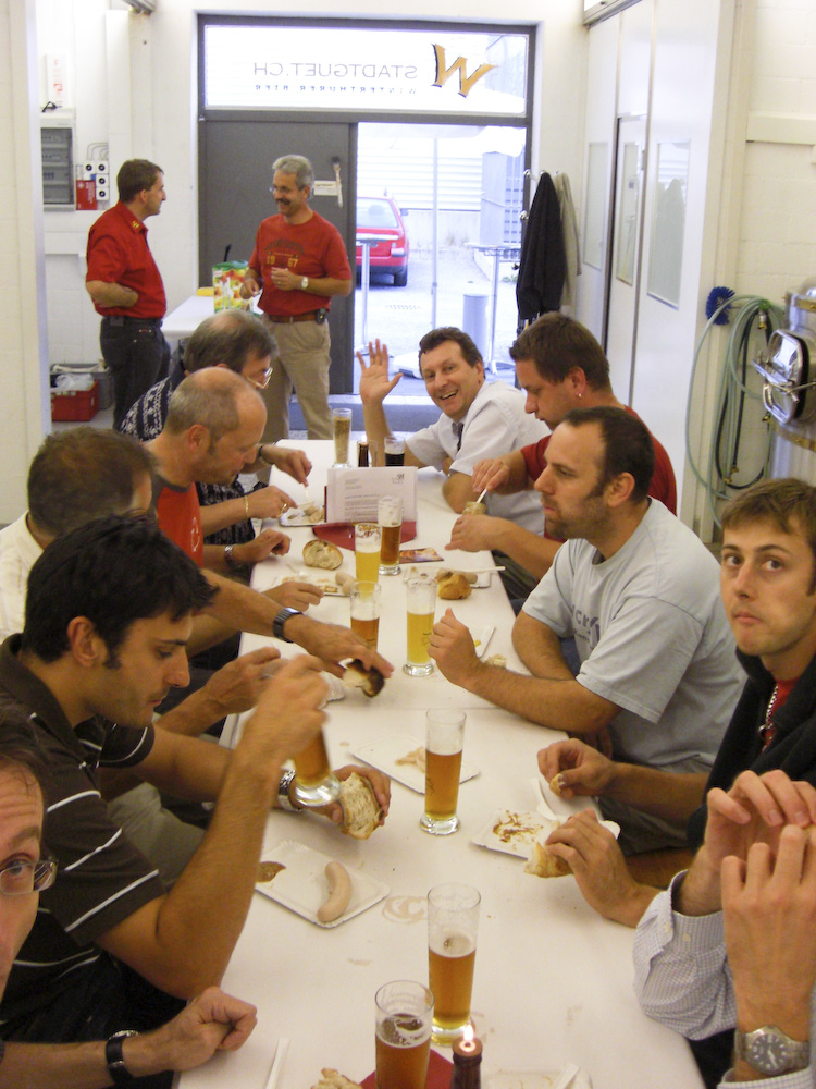 Unsere Senioren 1 (konkret: Martin Münger) organisierten eine Besichtigung der Brauerei Stadtguet in Winterthur. Nach einer kurzen Stärkung mit verschiedenen Biersorten, Nüssli, Chips und Weisswürsten, gab es eine interessante Einführung in die Wissenschaft der Bierbrauerei. Beat Spälti, der Geschäftsführer, erklärte uns kompetent und humorvoll, wie der Prozess des Brauens vor sich geht. Anschliessend gab es Schinkli im Brotteig und Salate ... ... und für Manuel (unser Vegetarier) eine schöne Käseplatte. Das Bier war gut, die Weisswürste auch und von der grossen Portion Schinkli blieb nur wenig übrig. So waren zum Schluss alle zufrieden und sogar auch noch nüchtern. Mehr Informationen findet ihr auf der Website der Brauerei Stadtguet und alle Bilder in unserem Fotoalbum. Fotos: Dani und Elias |